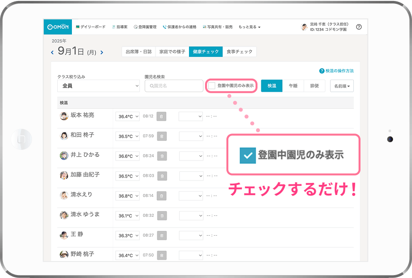 登園している園児のみを表示し、記録することができるので、入力のミスや負担を軽減することができます。
